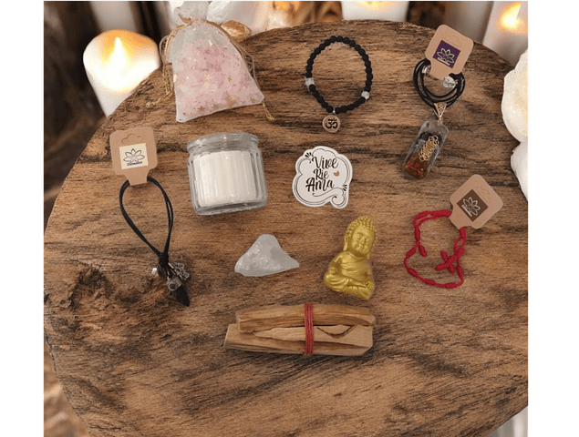 Incluye 9 elementos: Colgante orgón semilla de la vida, vela aromática vainilla, Pulsera Turmalina, Sales de Baño, Cuarzo Aura, Colgante turmalina, Palo santo, Pulsera hilo rojo y figura de Buda.